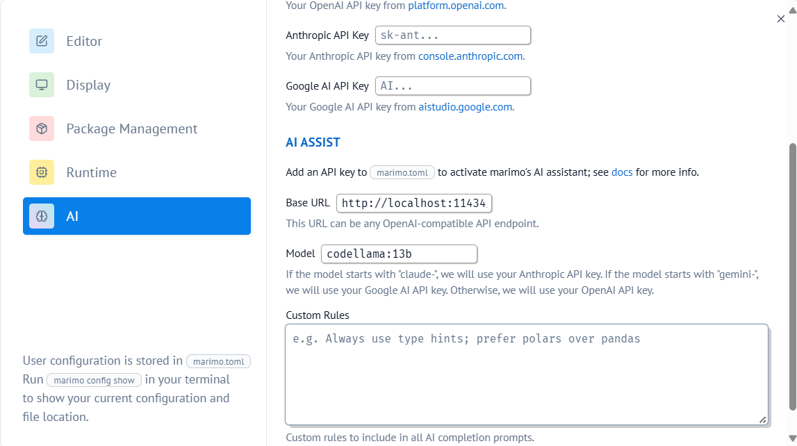 To use Google AI with marimo:
